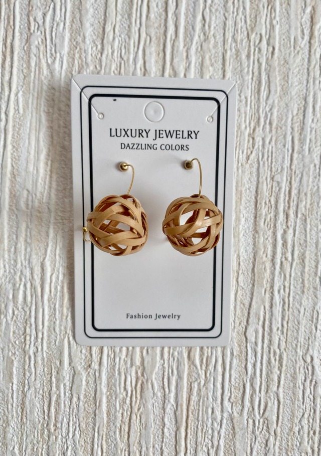 【金属アレルギー対応】 天然の晒竹を細く割いて編み込んだ丸玉を主役にした、 軽やかに揺れる上品なフックタイプのピアスです。 動くたびにチェーンがゆらりと揺れ、 顔まわりに柔らかな明るさをプラスしてくれます。 ♦特徴 ・丸玉:約1.5cm チェーンの長さ:3cm 着用時の全長:約6cm ・軽くてストレスフリーのつけ心地 竹素材ならではの軽さで、長時間の着用も快適。 ・竹のぬくもりを感じる編み込みデザイン ひとつひとつ違う表情があり、ナチュラルで温かみのある雰囲気に。 ・華奢なゴールドチェーンが上品さを演出 晒し竹のナチュラルカラーとゴールドの組み合わせが 和洋どちらのコーデにも相性抜群。 ・金属アレルギーに配慮したサージカルステンレス使用 フック部分には医療用にも使われるサージカルステンレスを採用。 金属アレルギーが出にくい素材で敏感な方でも安心してつけやすい仕様です。 ※日本製・職人手作り ※天然素材のため、色味や大きさに個体差がございます。 写真と異なる場合がございますのでご了承ください。