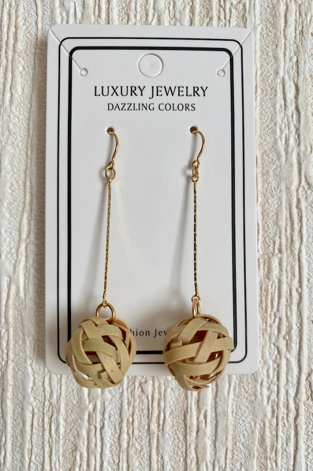 【金属アレルギー対応】 個性引き出す、黒竹で編まれたアジアンテイストな竹の丸玉と ツイストフレームのドロップピアスです。 耳元に自信と遊び心をプラス。いつものコーディネートに 輝きをもたらします。 ♦特徴 ・丸玉:約1.5cm 着用時の全長:約4cm ・温もりあふれる竹と優雅な曲線を描くゴールドフレームのデザイン 竹素材が持つ落ち着きとシャープな輝きが絶妙なバランスで 大人な雰囲気を演出します。 ・軽くてストレスフリーのつけ心地 竹素材ならではの軽さで、長時間の着用も快適。 ・金属アレルギーに配慮したサージカルステンレス使用 フック部分には医療用にも使われるサージカルステンレスを採用。 金属アレルギーが出にくい素材で敏感な方でも安心してつけやすい仕様です。 ※日本製・職人手作り ※天然素材のため、色味や大きさに個体差がございます。 写真と異なる場合がございますのでご了承ください。
